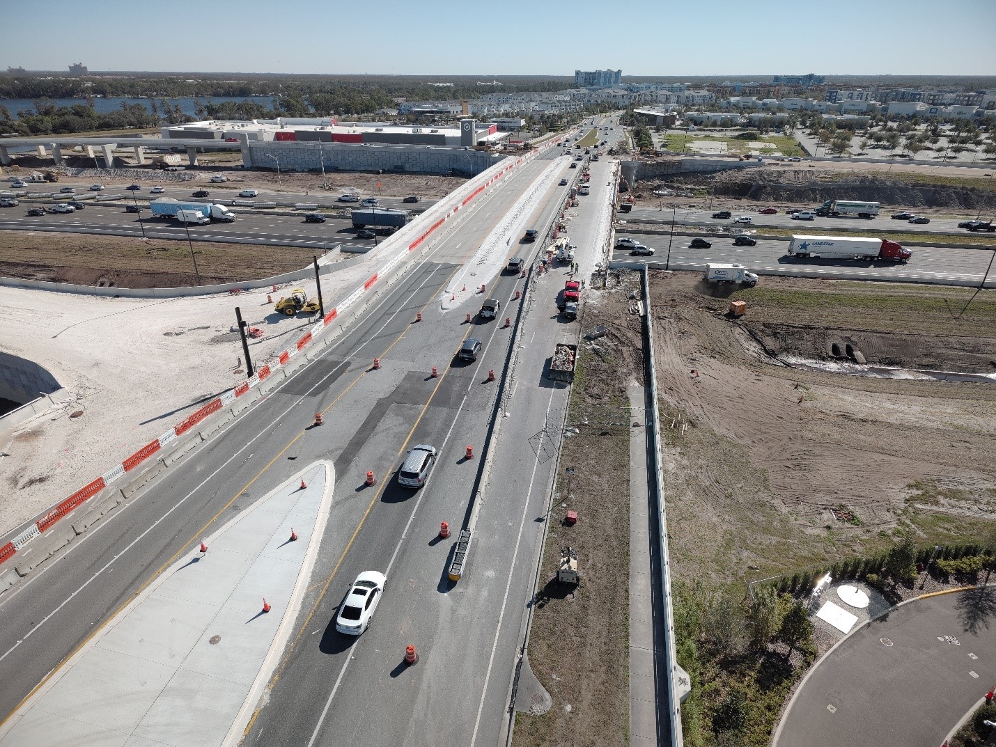 This work is part of a larger construction project to transform the Daryl Carter Parkway overpass into a diverging diamond interchange (DDI). The project also includes improvements to I-4 from west of Central Florida Parkway to west of Daryl Carter Parkway. Crews are constructing a single, buffer-separated, westbound express lane from west of Central Florida Parkway to west of Daryl Carter Parkway. The finished express lane will extend from west of Sand Lake Road to west of S.R. 536 and will be constructed in three separate projects.