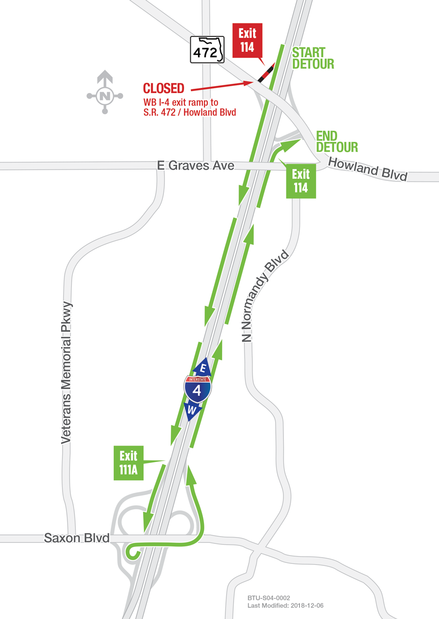 • Thursday, Jan. 3, from 10 p.m. to 6 a.m., the westbound I-4 off ramp onto S.R. 472 will be closed. Traffic will be directed to continue west on I-4 to Exit 111A and take Saxon Boulevard toward Deltona to eastbound I-4 and back to S.R. 472. (click here to see the detour map)
