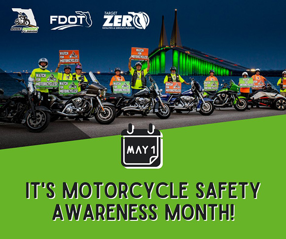 May is Motorcycle Safety Awareness Month and the perfect time to educate yourself and the motoring public on motorcycle safety to prevent and reduce highway deaths and incidents. According to the Florida Department of Highway Safety and Motor Vehicles (FLHSMV), in 2021, there were 612 injuries resulting from crashes in which a motorcycle was involved.