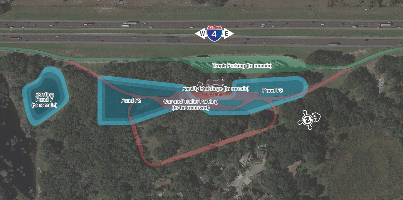 The new pond will be located where there is an existing parking area for cars, SUVs and other passenger vehicles. This also includes the removal of the picnic pavilions. Restroom facilities, vending machines and the truck-only parking area will be unchanged and remain available to truck drivers only. (Truck here defined per Florida Statute 320.01(10,11): “Heavy truck” or “Truck Tractor.”)