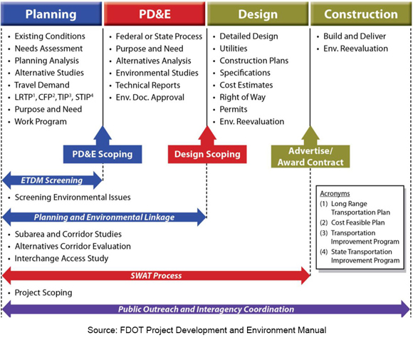 All Stages: Public Involvement – Throughout all four stages, FDOT seeks to keep the public informed through several communication platforms and by holding public meetings or open houses to explain plans, answer questions and receive comments.