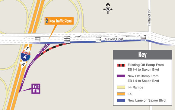 The Florida Department of Transportation (FDOT) is opening a reconfigured eastbound I-4 exit ramp to Saxon Boulevard (Exit 111A) the morning of Monday, December 10.