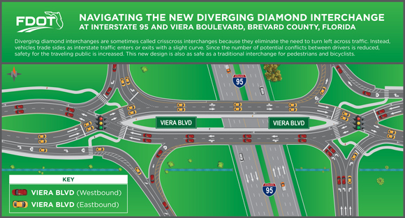 Central Florida’s first diverging diamond interchange (DDI) just opened in Viera on Interstate 95 (I-95) in early July.
