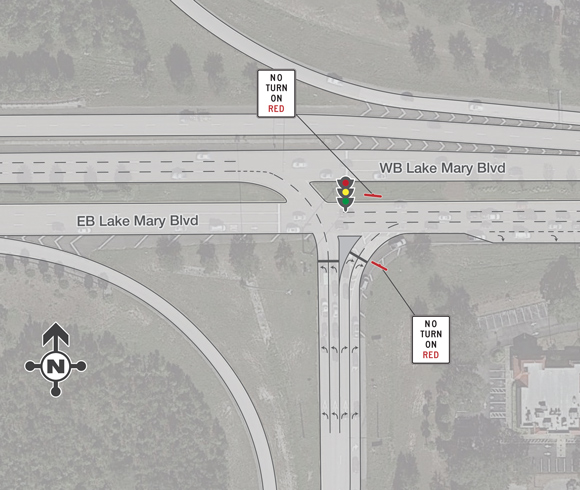 As part of the I-4 Beyond the Ultimate interim projects in Seminole County, the eastbound I-4 exit ramp to Lake Mary Boulevard has been resurfaced to extend the life of the pavement. Additionally, the new alignment of the exit ramp has eliminated the concrete island separating the two right turn lanes onto eastbound Lake Mary Boulevard. Both lanes now place traffic onto the Lake Mary Boulevard through lanes, meaning traffic in the right lane no longer feeds into the right-turn-only lane leading to Lake Emma Road. Finally, motorists exiting eastbound I-4 are no longer able to make a right turn on red at Lake Mary Boulevard.
