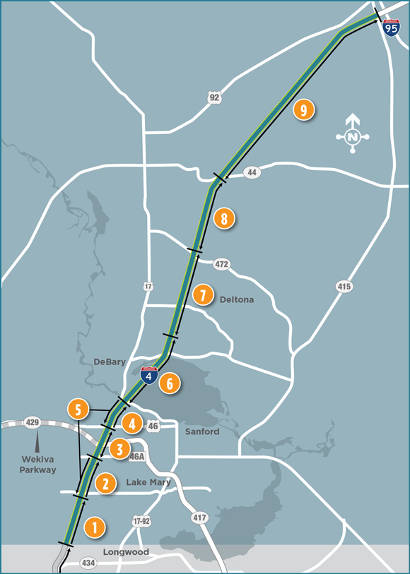 While traveling through this corridor, the public has a variety of options for taking a break from the road, including interchanges at S.R. 436 (Exit 92), S.R. 434 (Exit 94), Lake Mary Boulevard (Exit 98), and S.R. 46 (Exit 101C). Two park and ride lots are also available at Exit 108 to 295 Debary Avenue, and Exit 111B to 1299 Saxon Boulevard; however, there are no restroom facilities at these locations.