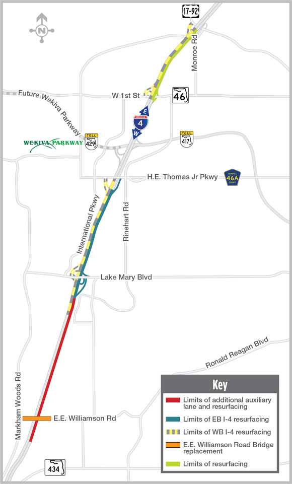 Milling and resurfacing of eastbound I‑4 from Lake Mary Boulevard to County Road (C.R.) 46A and from State Road (S.R.) 46 to the Seminole-Volusia county line was completed in May 2020. Both directions of I-4 between C.R. 46A and S.R. 46 will be repaved as part of the Wekiva Parkway Section 8 extension, which began construction in fall 2019.