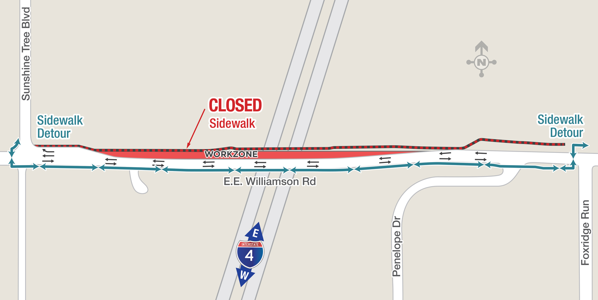 Due to this shift, pedestrians who cross over I-4 using the E.E. Williamson bridge should plan to use the crosswalk prior to the bridge to safely cross the roadway. Crossing the road sooner at the crosswalk is necessary as the sidewalk leading up to the bridge and over I-4 will now be on the south side of the road.