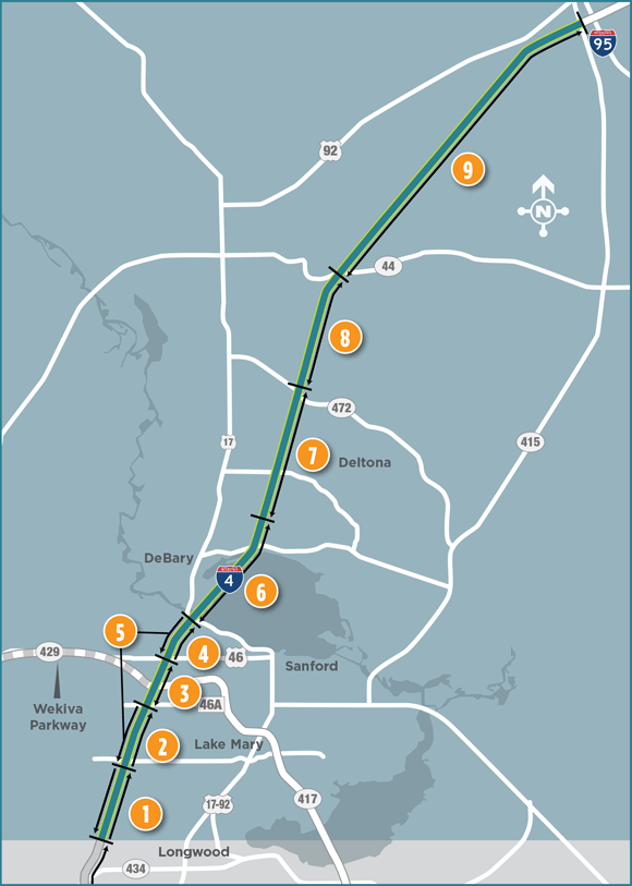 2.7 miles of I-4 from east of State Road (S.R.) 434 to west of Lake Mary Boulevard, milling and resurfacing anticipated to be completed in 2021. (FPID No.: 439682-3) |
