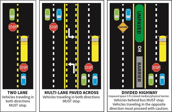 - If there is a raised barrier such as a concrete divider or at least five feet of unpaved space separating the lanes of traffic, drivers moving in the opposite direction do not have to stop for the bus, although they should slow down and watch for students.