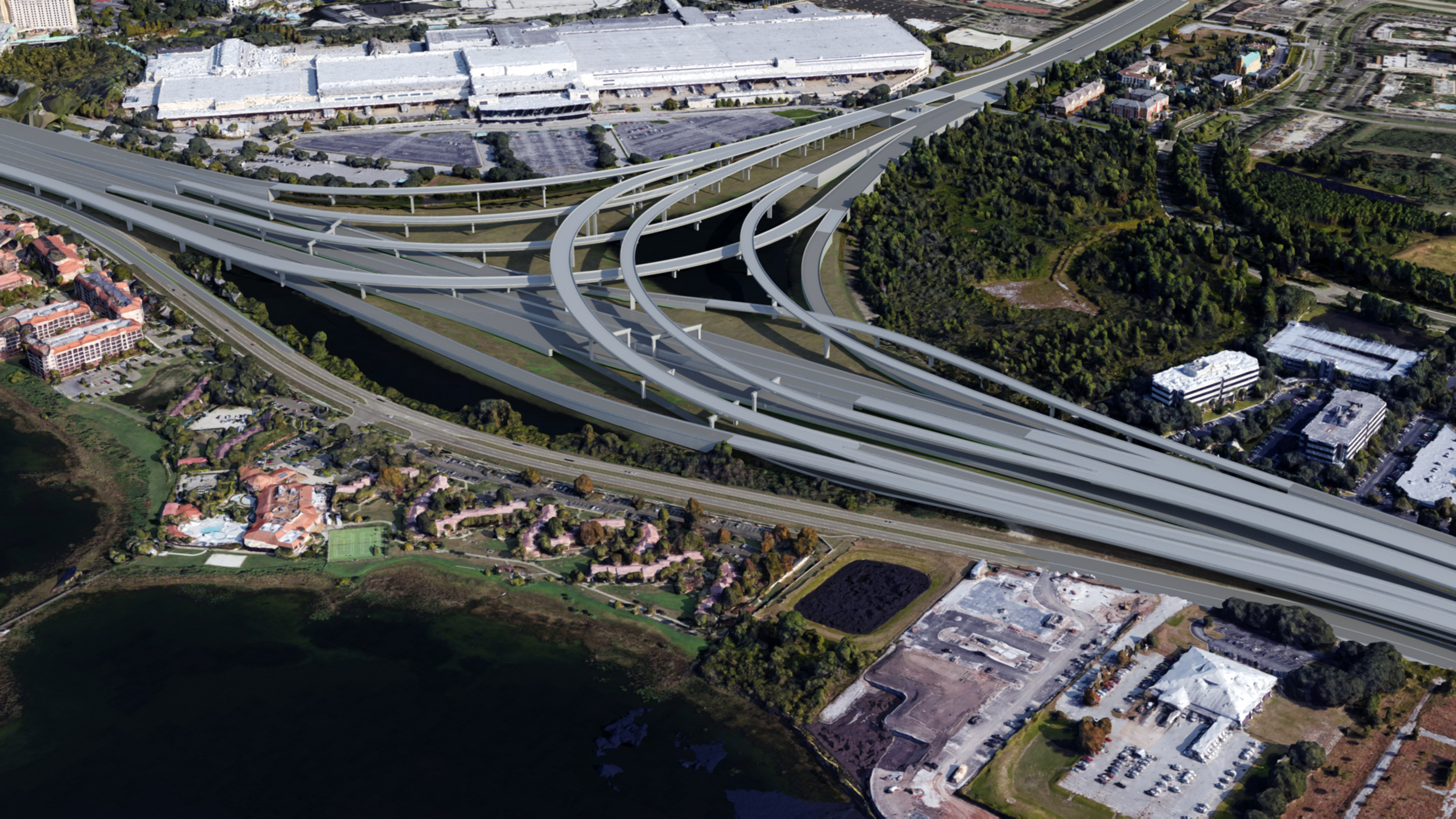 The designs intended to improve traffic flow and safety at these three interchanges include creating a modified diverging diamond interchange at the Sand Lake Road interchange, building entrance and exit ramps at Central Florida Parkway and adding Express Lanes direct connect ramps to S.R. 528.