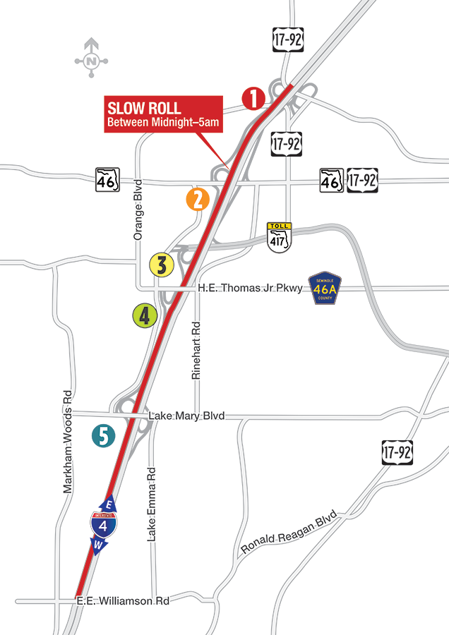 On eastbound I-4, the operation will begin at Princeton Street. The operation on westbound I-4 will begin at the U.S. 17-92 entrance ramp. Both directions will conclude near the E.E. Williamson Road overpass.