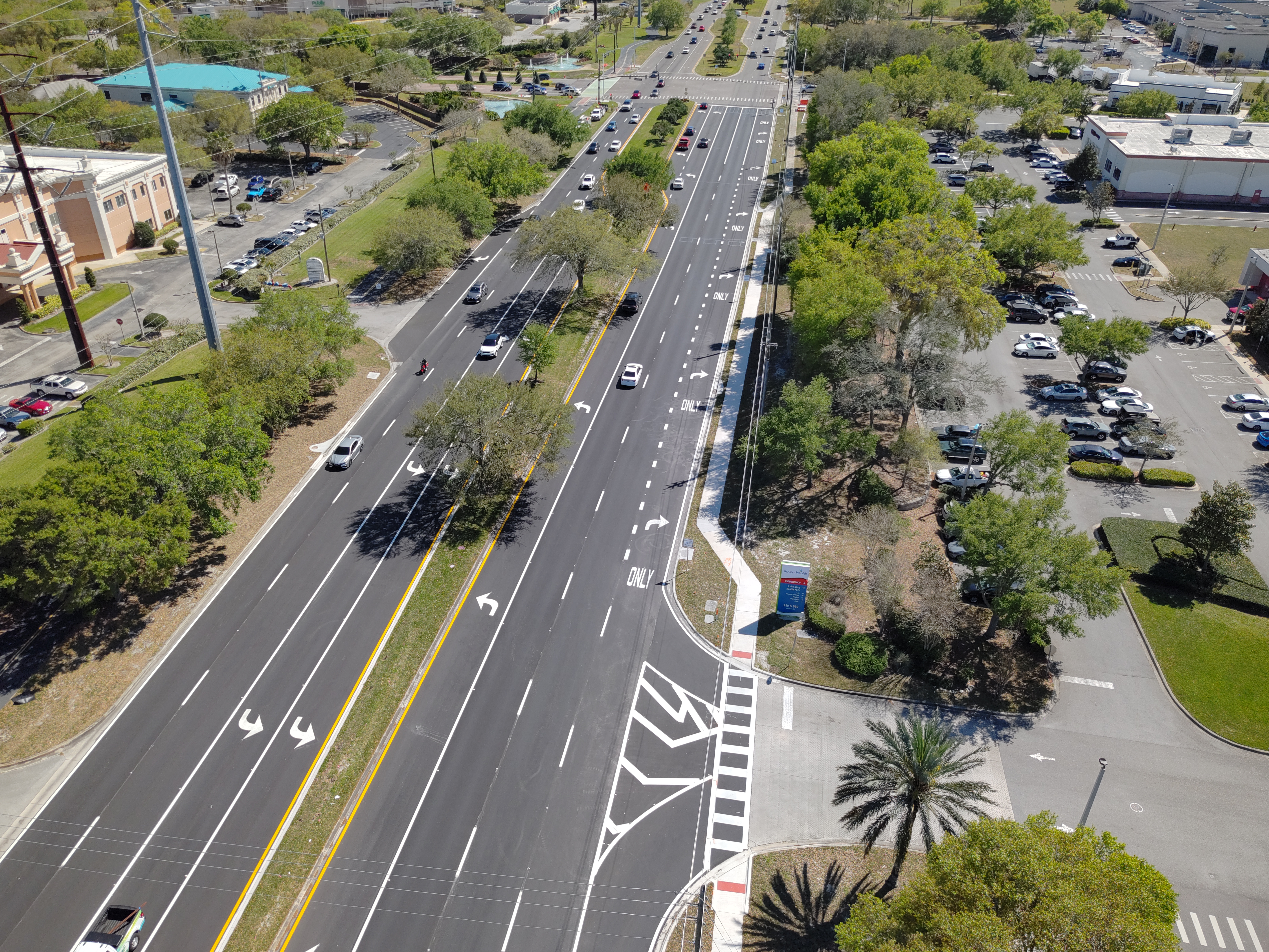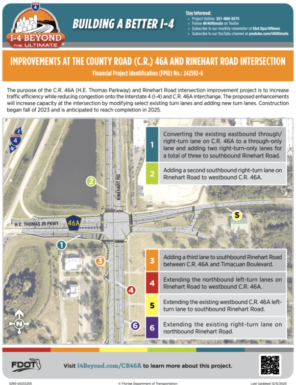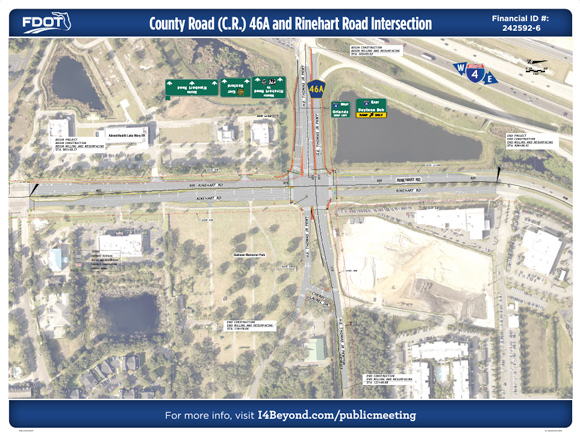 The C.R. 46A (H.E. Thomas Jr. Parkway) and Rinehart Road intersection improvement project increased traffic efficiency and reduced congestion onto the Interstate 4 (I-4) and C.R. 46A interchange. The enhancements increased capacity at the intersection by modifying select existing turn lanes and adding new turn lanes.