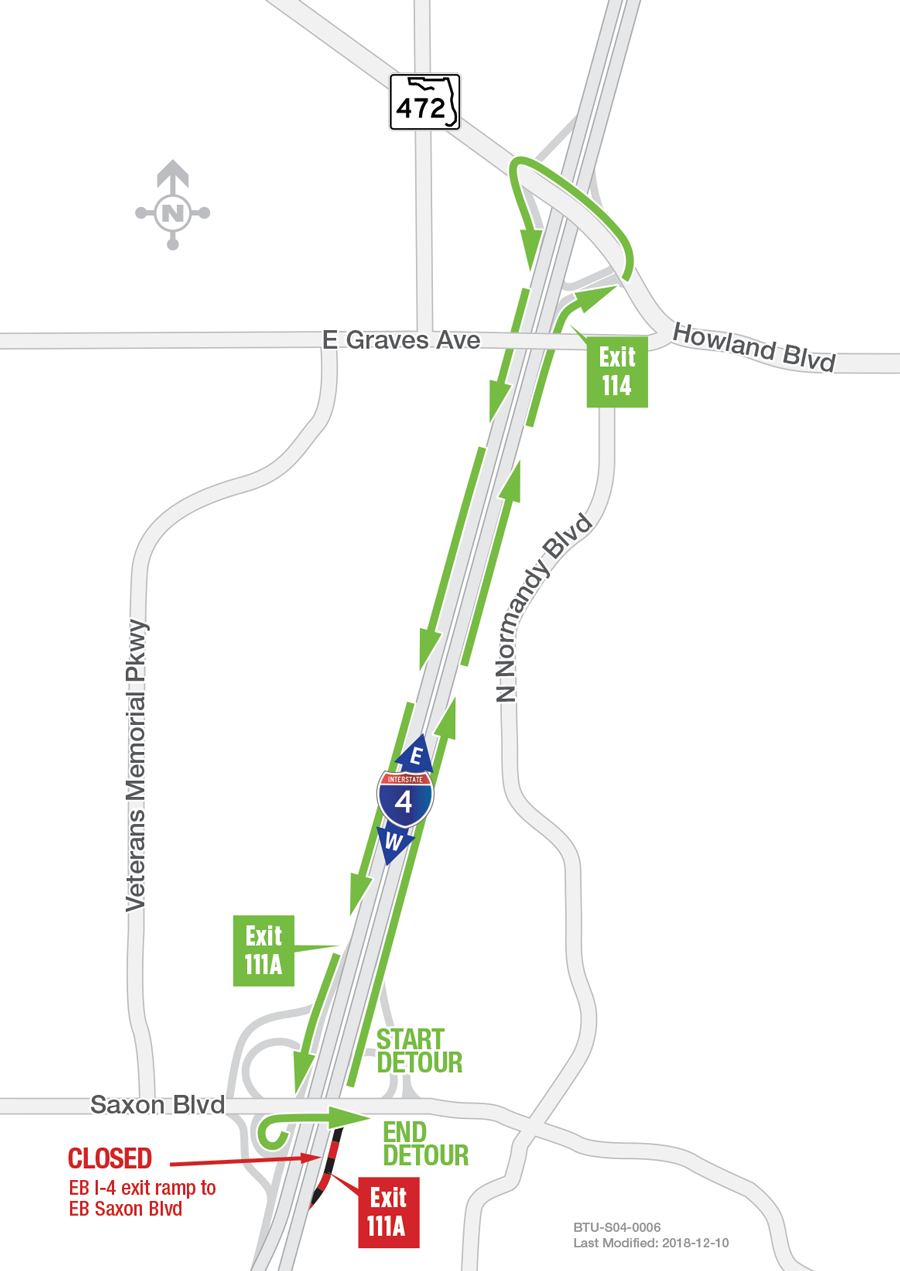 • Tuesday, Jan. 15, 10 p.m. to 6 a.m., the eastbound I-4 exit ramp to eastbound Saxon Boulevard will be closed. Traffic will be directed to continue on eastbound I-4 and exit at S.R. 472 (Exit 114), turn left, and take the ramp to westbound I-4 back to Saxon Boulevard.