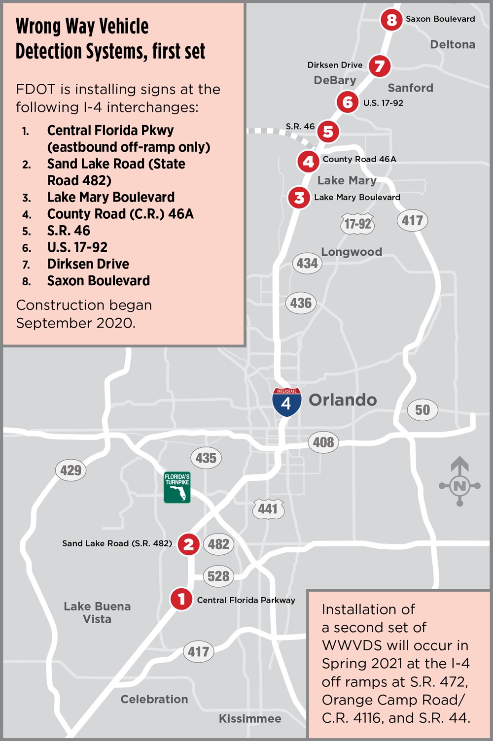 Installation of a second set of WWVDS will occur in Spring 2021 at the I-4 off ramps at S.R. 472, Orange Camp Road/C.R. 4116, and S.R. 44.